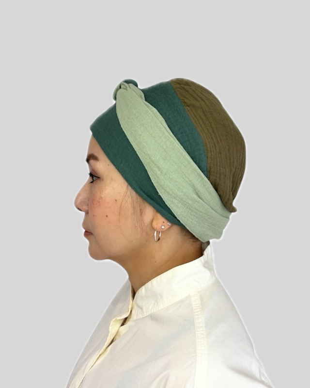 心と髪に寄り添うターバン。 ご病気になった、えみさんという一人のお友達の為に作られたターバン。 その名もEmmycap。 かぶりやすくって、かわいくって、お洒落になれちゃうそんなターバンです。 こちらは軽量(40g)で通気性もよく、保温性にも優れています。 ダブルガーゼを一重で製作。内側に縫い目が出ない方法で作っております。 試作を何回もし、素材、製法、にもこだわったEmmy Capとなります。 ⚫️色⚫️ カーキ クレープ (シボのあるクレープタイプのダブルガーゼ) ※シボとは生地全体できた細かな凹凸のことです。 ※撮影場所やお使いのモニター環境により実際の商品と若干お色味が異なる場合があります。 ⚫️素材⚫️ 綿 100% ダブルガーゼを一重で製作しております。 ⚫️サイズ⚫️ レディースサイズ 紐部分で結んでつけていただくので、自分の頭のサイズに合わせてかぶっていただけます。 ガーゼ商品のため、紐の長さの誤差がある場合がございます。(最大4㎝) 被って頂くのに問題はございません。 ⚫️お洗濯方法⚫️ 多少色落ちする事がありますので他の物とのお洗濯はお避け下さい。 蛍光増白剤の入っていない洗剤をご使用下さい。 長時間の水の浸漬はお避け下さい。 手洗いをおすすめしております。 アイロンはあて布をご使用下さい。